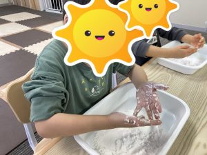 早速、片栗粉をそれぞれのトレイに入れ、実際に触ってみて「サラサラ、ツルツル、冷た〜い」とそれぞれの感触の感想が聞こえました😊