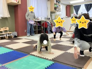 音楽がなっている時に歌に合わせてお馬さんになったり🐴、どんぐりころころでは寝っ転がってコロコロしたり、とっても可愛らしかったです🥰