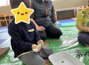 水を少しずつ入れていき、「モチモチ、ドロドロ、サラサラ」と感触の違いも楽しみました🎶