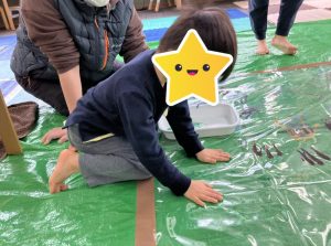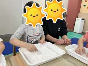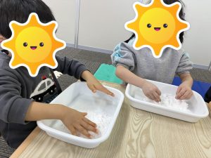 早速、片栗粉をそれぞれのトレイに入れ、実際に触ってみて「サラサラ、ツルツル、冷た〜い」とそれぞれの感触の感想が聞こえました😊