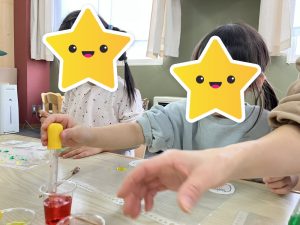 イチゴは赤、バナナは黄色、メロンは緑!えんぴつを持つかの様に上手に竹串を持ち、色を選んで慎重に色水を運んでいました✨