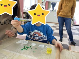 透明ファイルに油を塗り、色水をポタポタと垂らし、下の絵の所まで色水を竹串で連れて行く色水ぬりえをしました😊