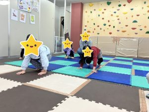 カエル→カエル跳び、クマ→手と足での4足歩行、オットセイ→足を伸ばし手の力だけで歩きます!!