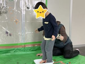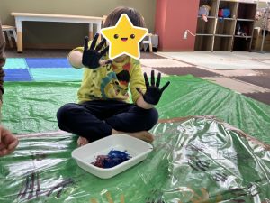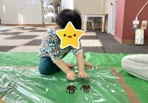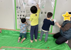 いつもは筆などの道具を使って扱う絵の具を、今日は直接手で触れられるということで、恐る恐る手に塗ってぺッタン!✋綺麗に取れた手形に大喜びで、段々大胆になりジャンプをして高い所に手型を付けたり、足に塗って足型をとったりと夢中になって遊んでいました![]()