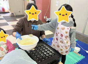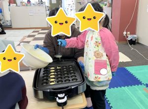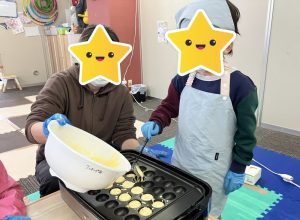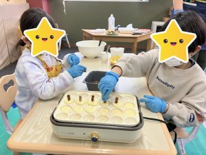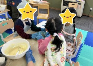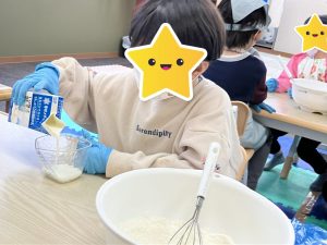 2つのグループにわかれ、順番等は相談してから行って下さいと声を掛け、スタッフは見守りつつ『「1番最初にやりたい!!」と道具を先に手に取っていたら、お友だちはどんな気持ちになるかな?』とだけ伝え、みんなで意見を出し合いながらクッキングを進める事が出来ていました👏