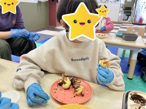 溶かしたチョコをつけてからアラザン等で飾り付けを行い、みんな完食していましたよ☺️✨️
