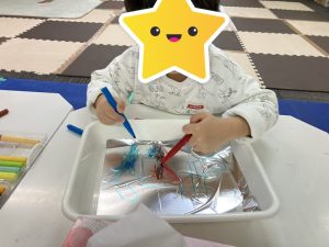 午前は、アルミホイルに水性ペンで絵を描き、そこに霧吹きでお水をシュッシュッとかけます。その上に真っ白なキッチンペーパーを置いて優しく押さえると、ペーパーに綺麗な模様が浮かび上がりました✨