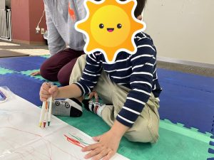 午前のお友達は色々な種類の緑色を使ってグルグル描きをしていたり、スタッフの手をかたどった手形に、泣いている顔や笑っている顔を描いて楽しんでいたり😊他にも、ペンを何本かまとめて持ち、カラフルな線をまとめて引いていたりと集中して取り組んでいました👏