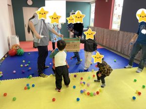 スタッフが持っている箱に床一面にまかれたカラーボールを入れる玉入れは、皆んな大興奮でした🤭🔥