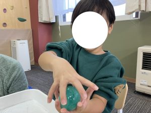 午前は、予めスタッフが蓄光パウダーを入れて作ったスーパーボールがあったので、それをみんなにプレゼントしてトレイの中で自由に遊んでもらっておしまいにしました😊