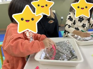 午前は、アルミホイルに水性ペンで絵を描き、そこに霧吹きでお水をシュッシュッとかけます。その上に真っ白なキッチンペーパーを置いて優しく押さえると、ペーパーに綺麗な模様が浮かび上がりました✨
