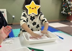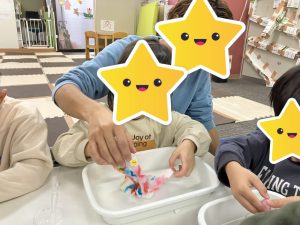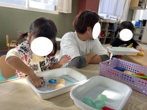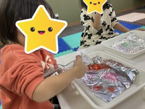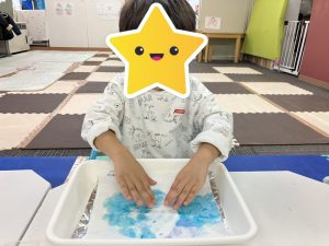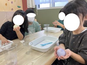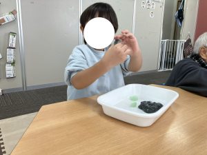 午前は、予めスタッフが蓄光パウダーを入れて作ったスーパーボールがあったので、それをみんなにプレゼントしてトレイの中で自由に遊んでもらっておしまいにしました😊