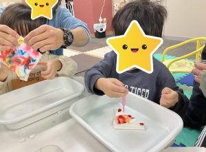 薄い色のスーパーボールを作りたい子は軽くサッと塗ってもらい、濃い色のスーパーボールを作りたい子は、底の透明部分が見えなくなるくらいたくさん塗ってもらいました!