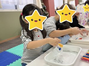 午後は、全員ラメを入れた後に欲しいお友だちだけ蓄光パウダーを入れました(案の定、全員入れていました😂)✨トレイで自由に遊んだ後に真っ暗な車庫に移動し、光るスーパーボールを眺めに行きました🌠