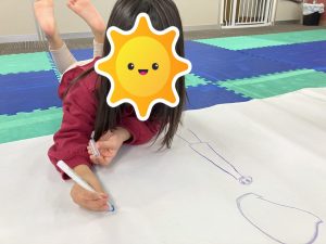 最後は模造紙に寝転がり、体に沿って線を描くと…何だか事件現場みたいになってしまいましたが😂💦面白いポーズをとって楽しみました✨