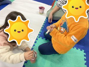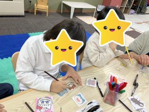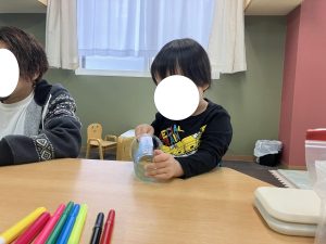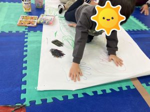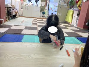 午前のお友達は色々な種類の緑色を使ってグルグル描きをしていたり、スタッフの手をかたどった手形に、泣いている顔や笑っている顔を描いて楽しんでいたり😊他にも、ペンを何本かまとめて持ち、カラフルな線をまとめて引いていたりと集中して取り組んでいました👏
