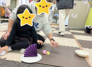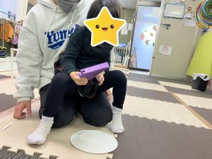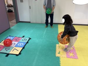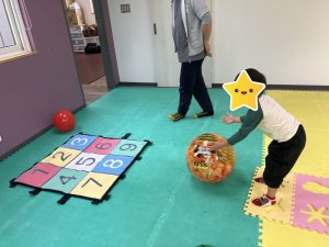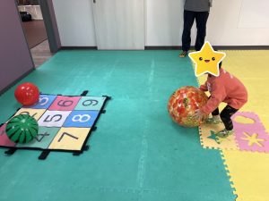投げるとなかなか的の上に乗らない!と感じた子は、転がして挑戦する姿もありました✨