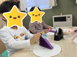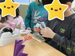 こちらは細長い画用紙をホチキスでリング上に留めて作りました。ホチキスの他にセロテープや両面テープ、はさみなど沢山の道具を使いましたが、みんなどれもとても意欲的に取り組んでくれました✨