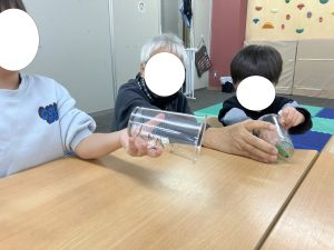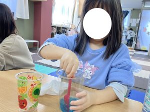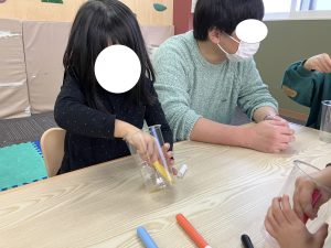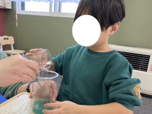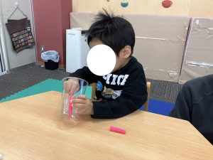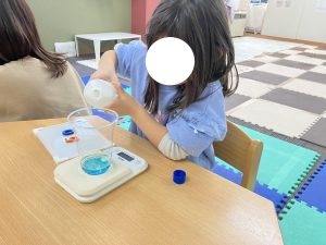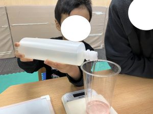 実際に計りにプラコップを乗せて洗濯のりを入れる時には、計りの隣に50のマグネットを置き、計りの数字とマグネットの数字が同じになるまでゆっくり入れてもらいました。