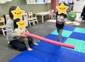 手と足の力も必要ですが、体の中心を知って動かすことも必要ですし、どの程度の力でスポンジカーを操作すればおもちゃがスムーズに運べるかな?と、考えながら力加減をしないといけません💡