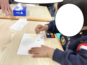 シール本体ではなく、シールが付いていた紙をマスキングテープで画用紙に固定し、たくさんの小さな穴に絵の具が付いた綿棒をトントンと付けると…!?