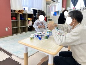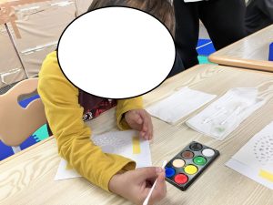 何色にしようかな?青と赤を混ぜたら何色になるかな!?なんて会話を楽しみながら、好きな色でステンシルを楽しみました(^^)