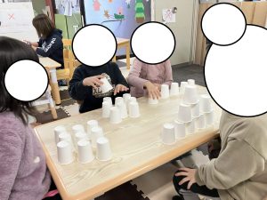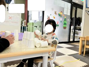 紙コップを積む遊びの中で、紙コップを早く片づけるゲームが始まり、9個の紙コップを並べて誰が一番早く片付けることが出来るのか勝負も楽しむ姿がありました✌