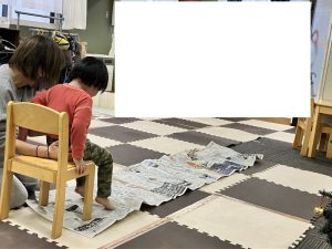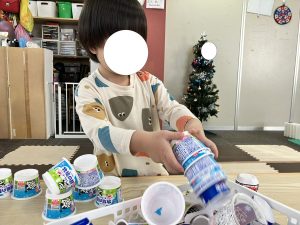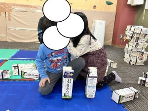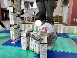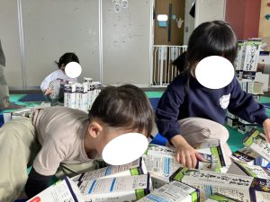 午前は、積み上げる前にまずは牛乳パックの山に飛び込んだり、ヨーグルトパックをひたすら出してバラバラにしたり、全身で廃材と戯れていました(笑)