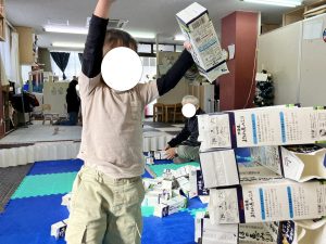 いつもは制作の材料になる廃材ですが、こんな遊び方もできるのです(`・ω・´)b(今回の廃材は、スタッフの知人に協力してもらってたくさん集めることが出来ました👏😂)