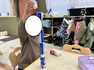 午後は、「今日はたくさんの材料があるけど積み上げることしか出来ないよ!」と先に伝えると、「え~!!」と言いつつも、遊びが始まると夢中になってお友達と積み上げていました🌷