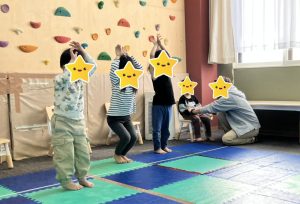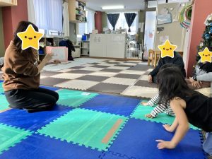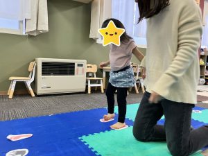初めにウォーミングアップとして、『グーグーチョキチョキパーパーパー』の歌に合わせて手遊び✋を行い、その次は足👣で、そして最後は手と足を合わせてやってみました!