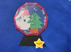 透明のドームの中に入れるツリーと雪だるまを頑張ってハサミで切ったり、糊でパーツやシールを貼ったりしながら進めました✂