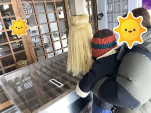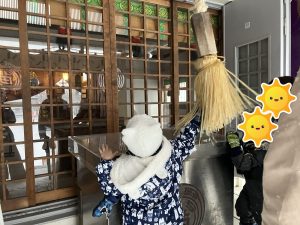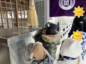 お賽銭箱にお金を入れ、1人1人鈴緒を持って鈴を鳴らしてもらい、お願い事をしてきました✨