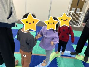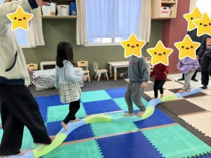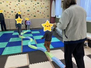 一本橋を慎重に歩き、お友達とぶつかったらじゃんけんです✊ルールをしっかりと理解して楽しむことが出来ていました✨