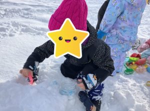 自由遊びがいつもより早めのお片付けになり、「まだ遊びたかった〜」という声が聞こえましたが、「今日はこの色水を持って行って、雪でアイス作ろう🍨」とペットボトルの色水を見せて誘うと、みんなキラキラの目でお出かけ準備をしてくれました😆