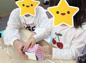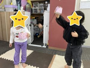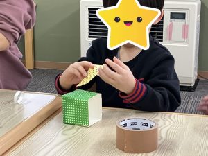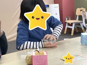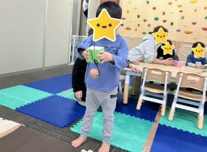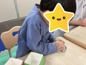 牛乳パックに折り紙を貼ったり、新聞紙を丸めてボールを作ったり、たくさん手先を使いながら一生懸命取り組んでくれました👏