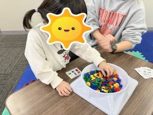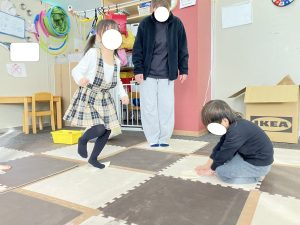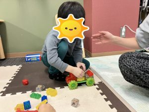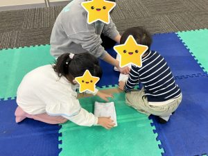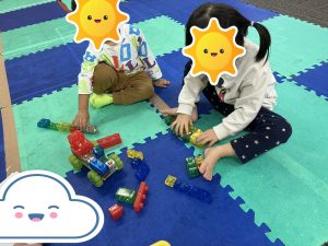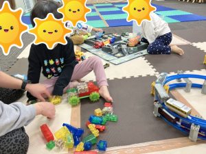 おともだちが使っている所へ行き、見ていると「使っても良いよ😊」と声をかけられていたり、使いたいものが被ってしまった時には、言い合いになる場面もありましたが、みんなで仲良くと声を掛け、どうしたら良いかを考える時間を設け、「こっちなら使っていいよ(>_<)」と半分こで使う提案が出来ていたり、それでも上手くいかない時には、あいうえおでよく使っている【時間で交代】をスタッフが提案し、順番に使えていたり、