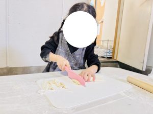 出来た子から車庫に移動し、うどんを伸ばして包丁で切ってもらいます🔪