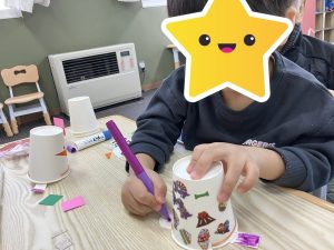 紙コップに雪だるまの帽子を貼り、人参に見立てた鼻を貼ったり、マジックで雪だるまの