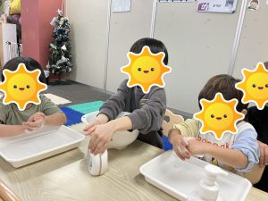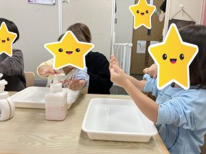 みんなで、一つ一つの作業を確認しながら、しかっり水で手を濡らしてから石鹼をつけ、手の平→手の甲→爪→指の間→親指ねじり→手首→洗い流す→拭き取りと行い、無事にみんなの手からは、ばい菌スタンプは消えていました👏