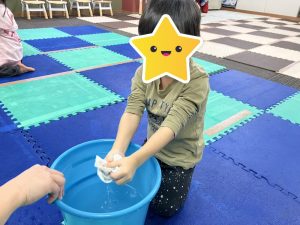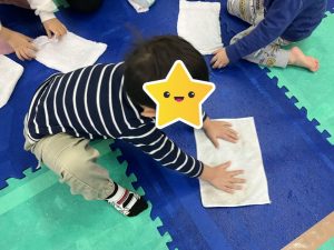 午後のお友達は相談して玄関チームとお部屋チームに分かれ、雑巾絞りもやってもらいました![]()