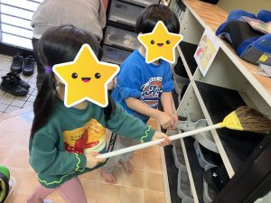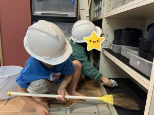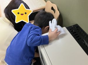 「うわ~ここ汚い!」「雑巾がこんなに黒くなったよ!」と、綺麗になることを喜びながら取り組んでくれる姿、とっても頼もしかったです💮(なぜか地震用のヘルメットを発見し、かぶりながら熱心に掃除している可愛いお友達もいました😂)