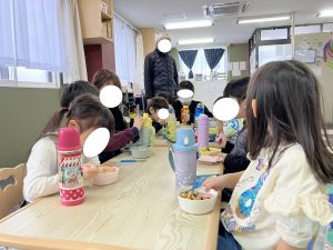 」と、口をおさえずにくしゃみをするとウイルスがかなり遠くまで飛んでいく様子を見てもらいました。それが他の人のお口に入ると、その人も具合が悪くなったりするんだよ、というお話をし、じゃあどうすればいいかな?と聞くと、お口を押さえる真似をしてくれたお友達がいました👏咳やくしゃみをする時は、口を押えたり人の方に向けてしない、という事を確認し、練習もしてみました😊体調管理の難しいこの時期、ちょっとしたことの積み重ねでみんな元気に過ごせると良いなと思います![]()