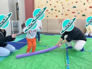 それぞれの陣地を作り、自分の陣地の中に立ちます。真ん中に立ったスタッフがプールスティックを持ち、ランダムにゆっくり振ります😊