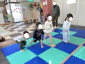 陣地から少しはみ出てしまうお友達もいましたが、よく見ながらジャンプで避けることができ、みんな楽しみながら体を動かしていました❤️