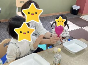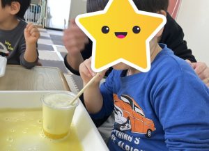 「シャボン玉が出来る!」と予想してくれたお友達もいましたが、やってみると一気にモフモフの泡ができ、みるみるうちにカップから溢れる様子に大興奮のみんな![]()