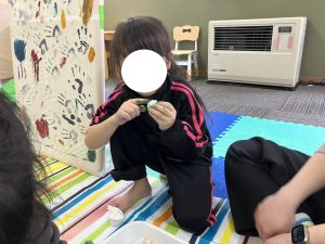 おやつの時間、よく見ると顎や手など、なかなか自分の目で見えにくい場所に絵の具がついていることに気付き、友達やスタッフと笑い合う微笑ましい時間がありました💕