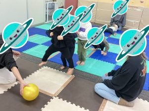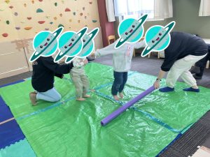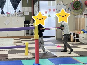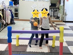 お友達と協力をしつつ、ボールの動きをよく見る力やタイミングを合わせる力を育てながら、楽しく体を動かすことができました😊