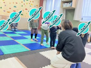 それぞれの陣地を作り、自分の陣地の中に立ちます。真ん中に立ったスタッフがプールスティックを持ち、ランダムにゆっくり振ります😊