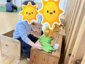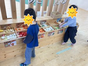 果物・野菜コーナーでは、小さな子に先に譲ってあげたり、同じ玩具で遊びたい時には「い~れ~て(^○^)」と声を掛けたり、順番に仲良く遊ぶことが出来ていました✨
